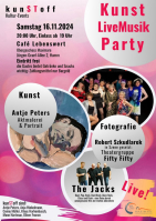 Es war eine tolle Partyatmosphäre in unserer gut besuchten Kunstwerkstatt anlässlich der Hammer Kulturnacht, was durch Kunstoff präsentiert wurde. Die Band Mevistos hat ordentlich eingeheizt und Mone und Klaus haben Lyrik sehr stimmungsvoll vorgetragen! Mone hat sogar ein eigens zu meinem Bild "Ritt mit dem Teufel - vom Teufel geritten" kreiertes Gedicht vorgetragen. Klasse! Vielen lieben Dank dafür!!